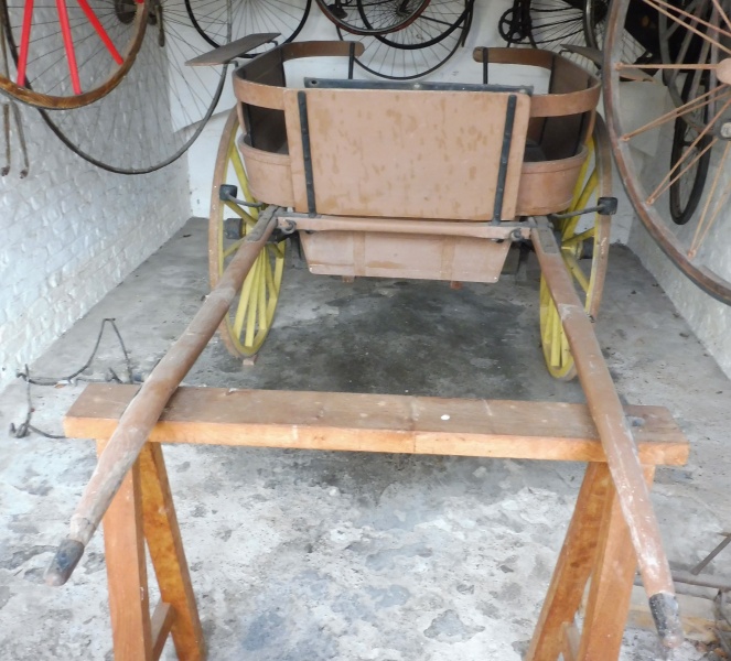 Governess Cars, sometimes called Tub Carts for obvious reasons, have a deep tub-shaped body with access through a door at the back, and seats each side. They were often used by a governess (hence the name), or possibly a mother, to take the children out for a drive. She would drive sitting diagonally in the back right-hand corner. Although the seat and the cushion on the right hand side have been shaped for this purpose, this would still have been difficult and uncomfortable. Only the quietest pony, or sometimes a donkey, was suitable to be driven to a Governess Car, not only because of the awkward driving position, but because it was difficult to get out quickly and run to his head if she needed to. The cranked axle allows the body to be mounted lower, dropping the centre of gravity and making it difficult to overturn.