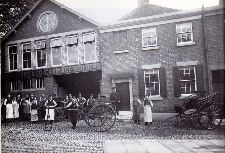 George Mountford founded the works I'm 1819. From this photograph taken in the 1890's it appears that they specialised in the building of country vehicles with some fine looking Norfolk carts and a dog cart on display. The building still stands in Shrewsbury to this day.