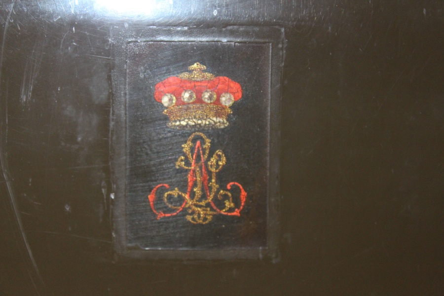 The Chariot has been repainted in fairly recent years. Upper panels and the boots are black with the lower panels, the front and mid panels and the door frame painted very dark brown. The front side panels, under carriage and wheels are painted yellow.The wheels, springs and under carriage are lined with red and brown. A coat of arms is painted on the door panels.